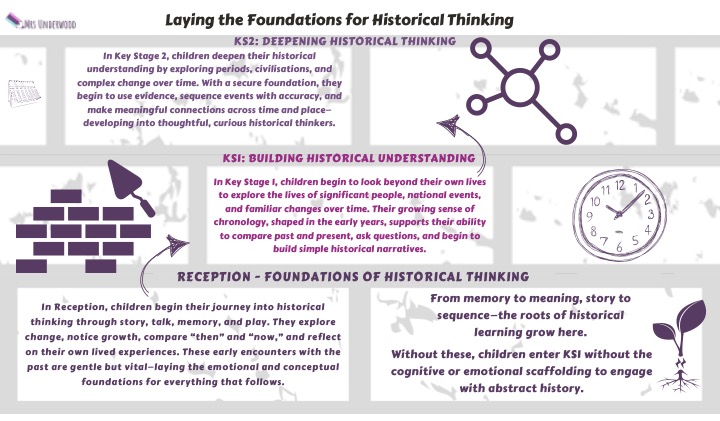 Diagram 5: The development of historical thinking from the foundations laid in Reception to the deepening complexity of Key Stage 2. It shows how memory, talk, and play in the early years provide the emotional and conceptual scaffolding children need to engage meaningfully with the past as they move through school.